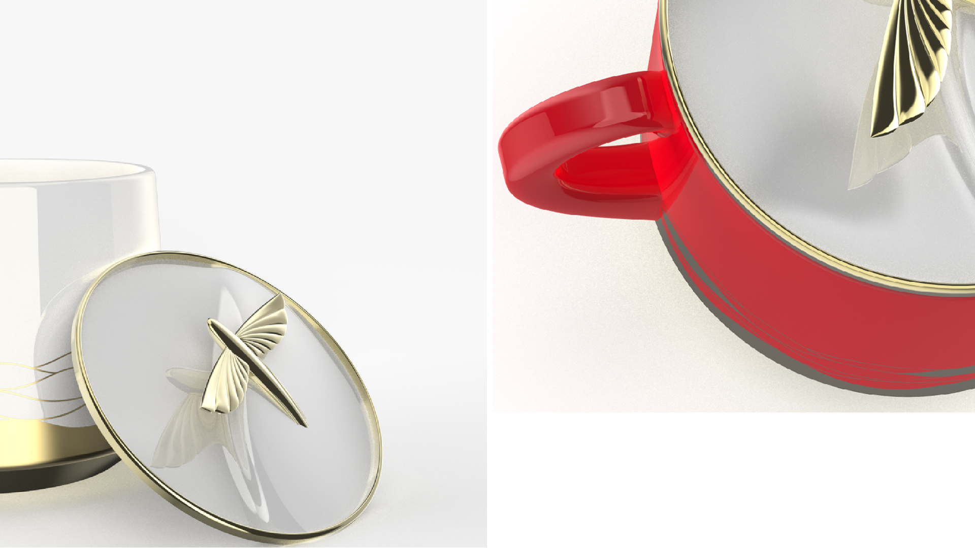 將飛魚從海面躍然而出的情景應(yīng)用在整套馬克杯上,杯墊和把手的抽象造型源自于朵朵海浪,杯蓋上塑造出一只沖出海面的飛魚,提取大海波濤起伏的線條,繪制成圖樣應(yīng)用于杯身上。