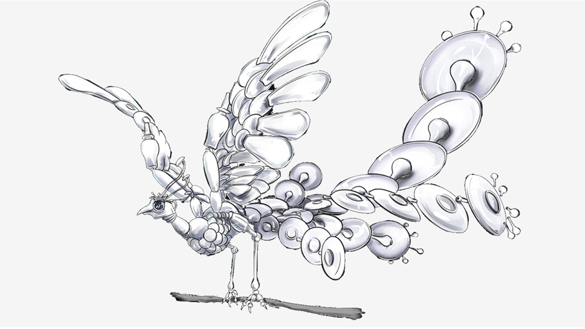 YU是一只由著名釉色瓷構(gòu)成的瑞獸。YU在瓷世界中掌管“瓷”之釉色,他的設(shè)計原型是“朱雀”。朱雀作為傳說中的神鳥,總是充滿了神秘的浪漫主義色彩。YU最開始出場時被設(shè)定為一只純白色的朱雀,當(dāng)她開屏?xí)r,會吸收環(huán)境中的顏色(10件中國著名顏色釉瓷器上的顏色),瞬間變得光彩照人。