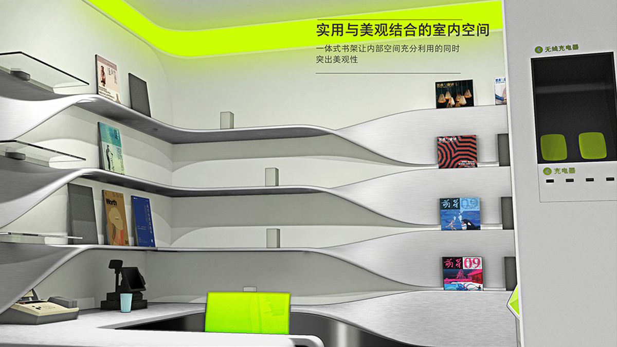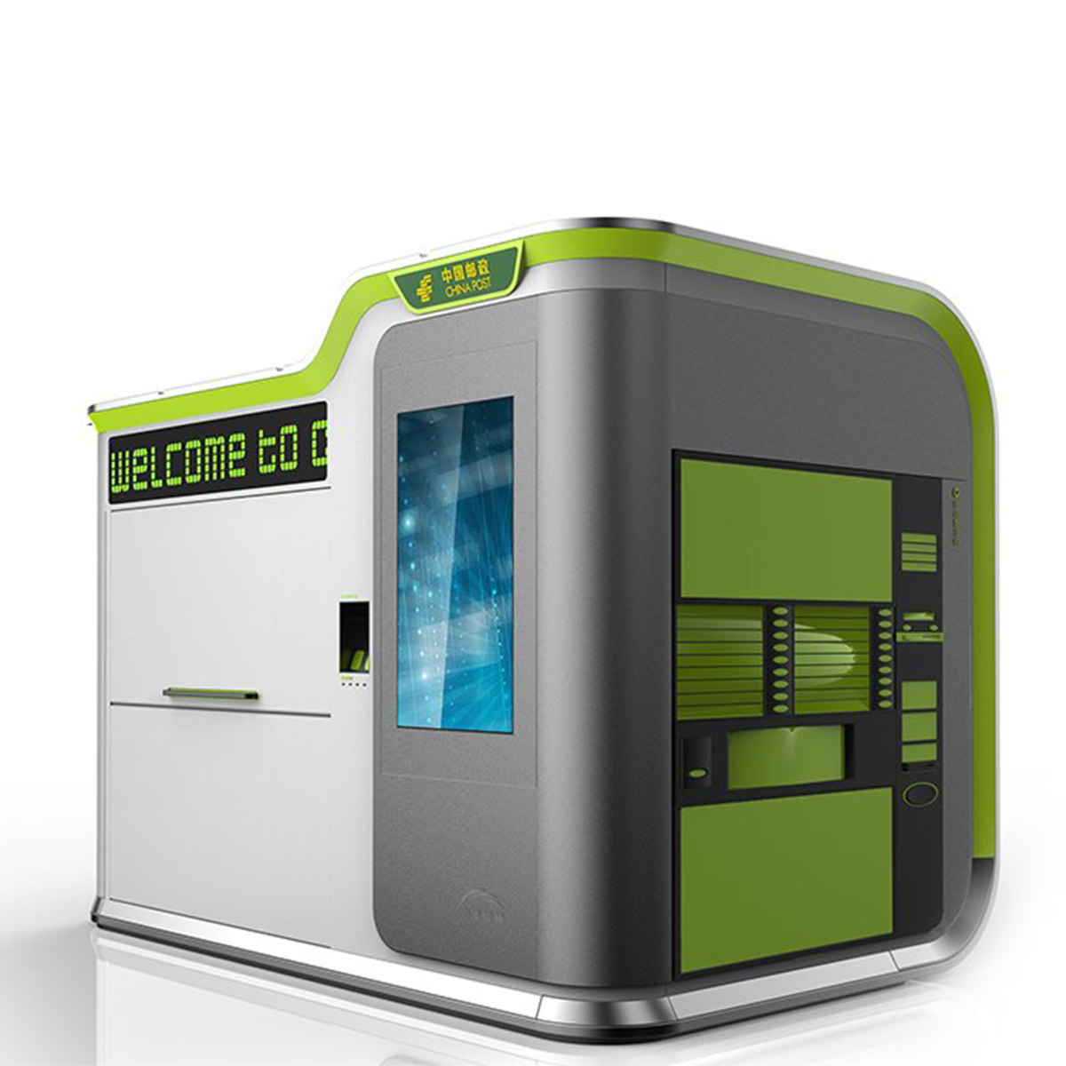 造型以現(xiàn)代簡(jiǎn)約風(fēng)格為主,順應(yīng)現(xiàn)代市場(chǎng)和審美需求。簡(jiǎn)潔的外觀、內(nèi)部流暢的曲線和燈光效果相呼應(yīng),凸顯產(chǎn)品的科技感同時(shí)又不顯得沉悶。多功能和模塊化設(shè)計(jì)更是人性化設(shè)計(jì)的主要體現(xiàn),由形式至意,從意到神韻,無不強(qiáng)調(diào)中國(guó)郵政的服務(wù)宗旨,以人為本。