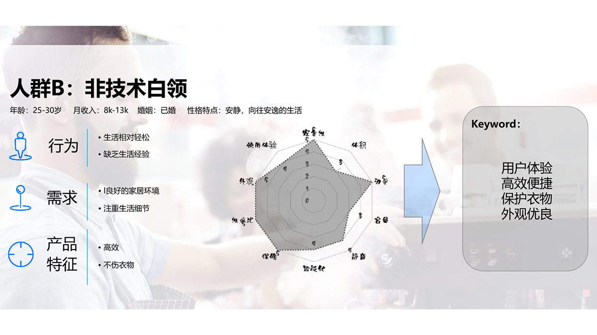 ? ? ? ? 滾筒洗衣機(jī)的普及很大程度擴(kuò)大了用戶群體,這要求團(tuán)隊(duì)需要從多個維度對人群進(jìn)行劃分和了解。從角色數(shù)據(jù)的角度,不同的職業(yè)決定了收入層次及消費(fèi)能力,從而影響滾筒洗衣機(jī)的定價。木馬團(tuán)隊(duì)深入研究劃分消費(fèi)者族群,將其分為基層服務(wù)者、非技術(shù)白領(lǐng)及商業(yè)服務(wù)業(yè)三類,分別剖析了者三類人群對于洗衣機(jī)的不同需求,并制作用戶畫像,如下圖。
