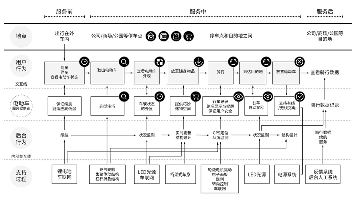 ? ? ? ? 因此,自備工具無(wú)疑成為具有高自由度的最佳選擇。木馬通過(guò)對(duì)雅迪mini電動(dòng)車(chē)的服務(wù)設(shè)計(jì),探索車(chē)、人、環(huán)境三者之間的關(guān)系。