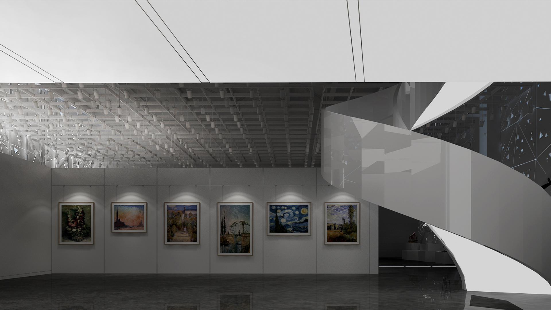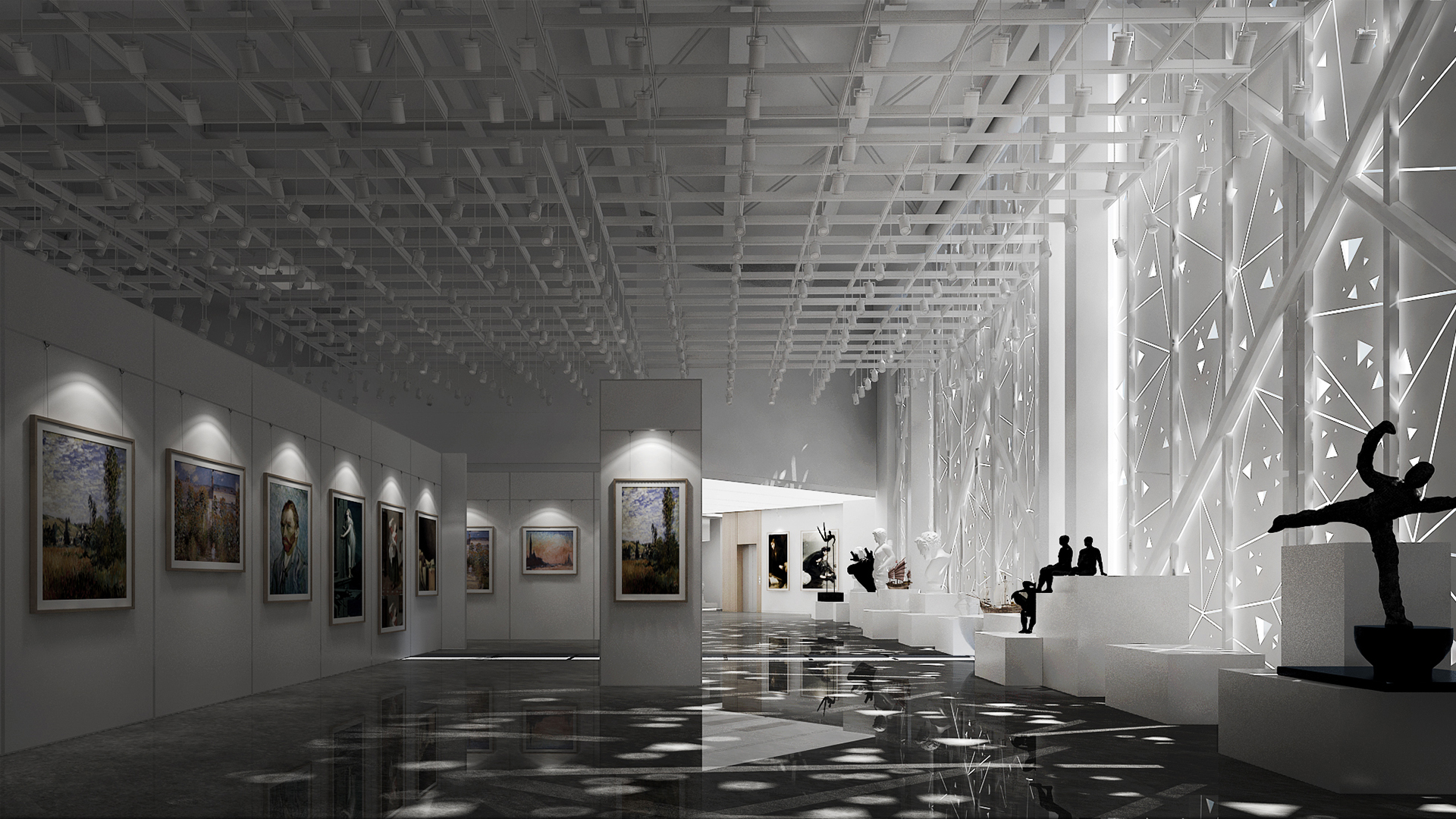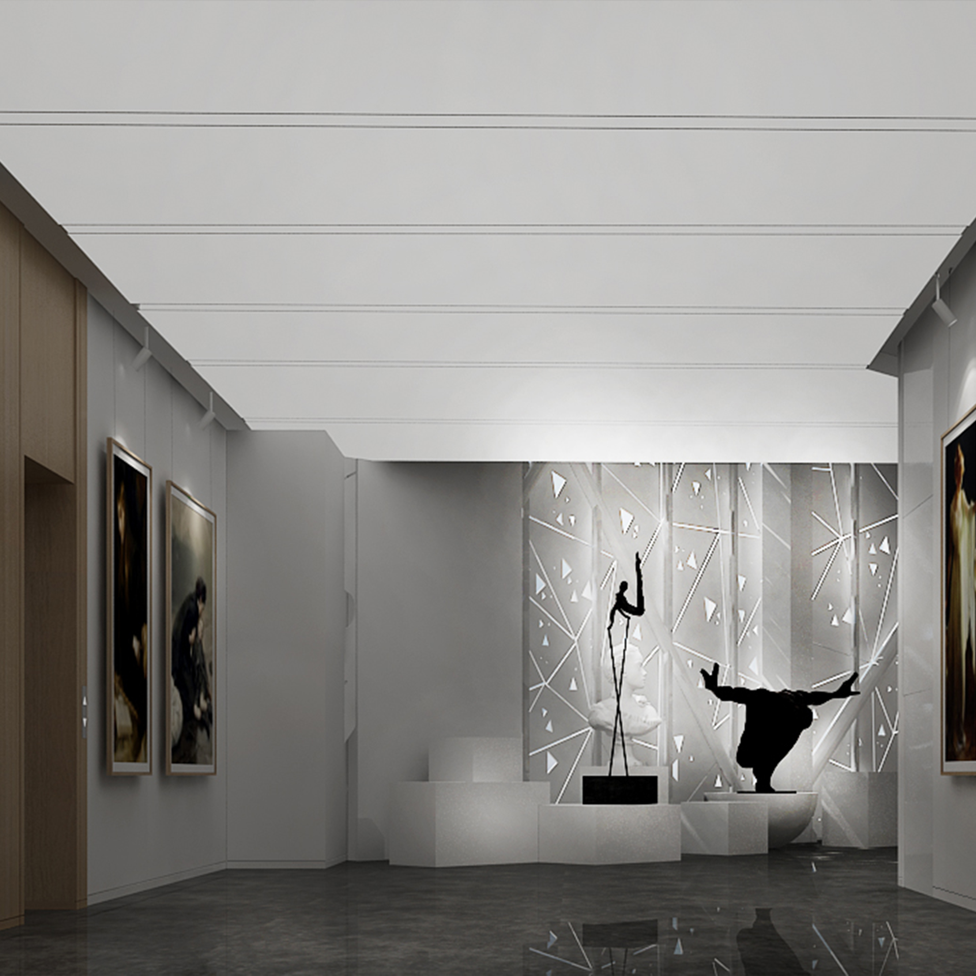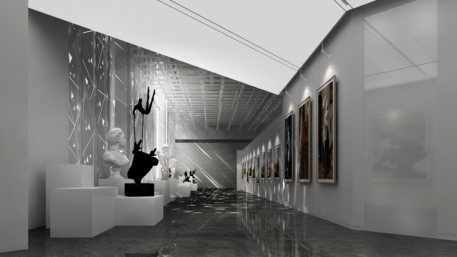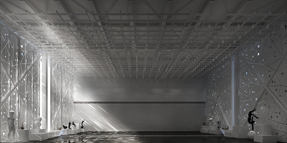 展館主要呈現(xiàn)黑白灰三色,黑白灰的色彩具有很高的審美價(jià)值,他們相互襯托,對(duì)比強(qiáng)烈,混合作用后會(huì)產(chǎn)生意想不到的藝術(shù)效果,產(chǎn)生千姿百態(tài)的節(jié)奏,極其富有韻律感和美感。這樣的空間不僅充滿(mǎn)情調(diào),更能襯托期間多彩的藝術(shù)品、豐富的畫(huà)作和內(nèi)涵的雕塑。
