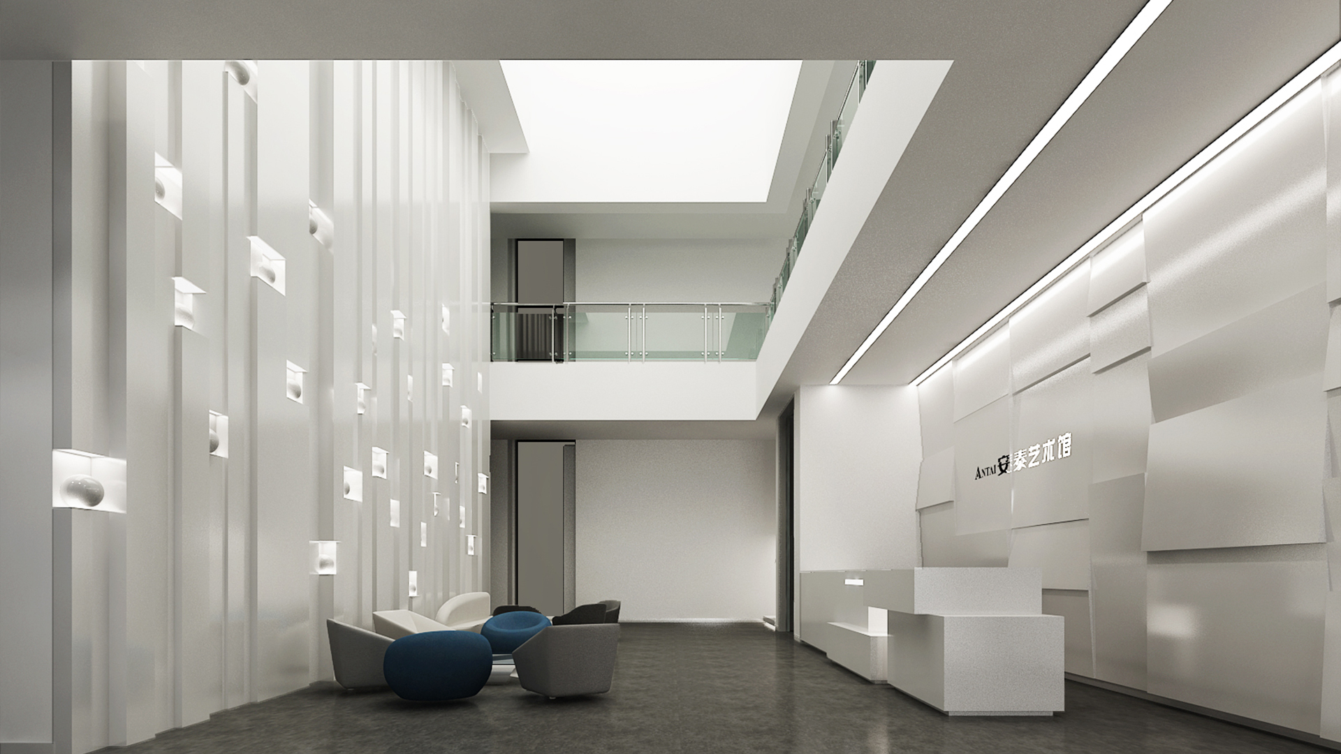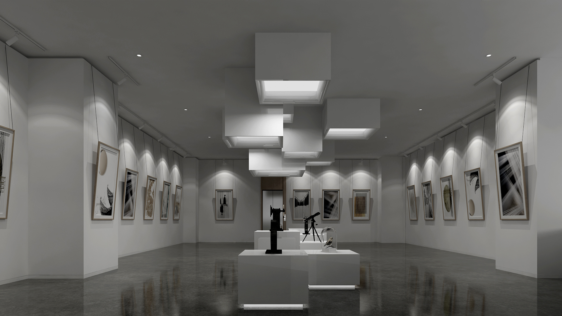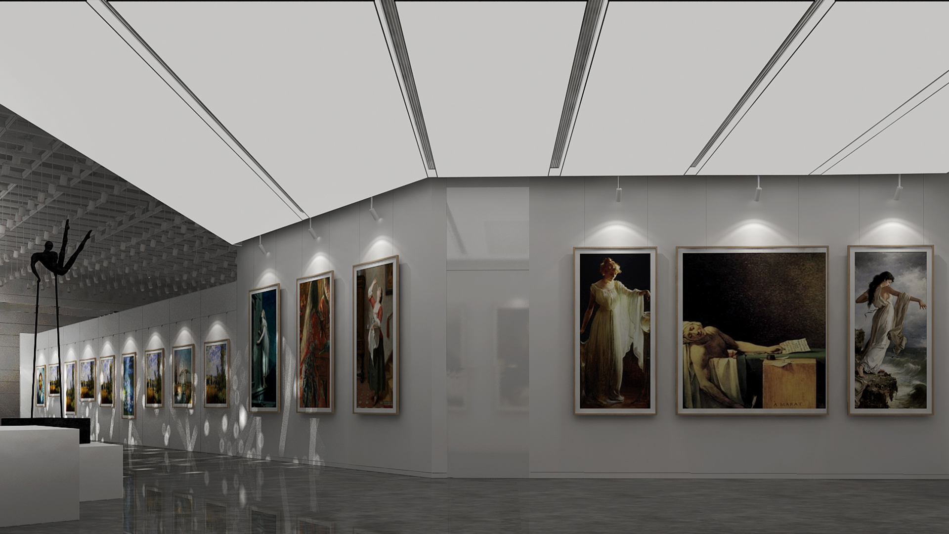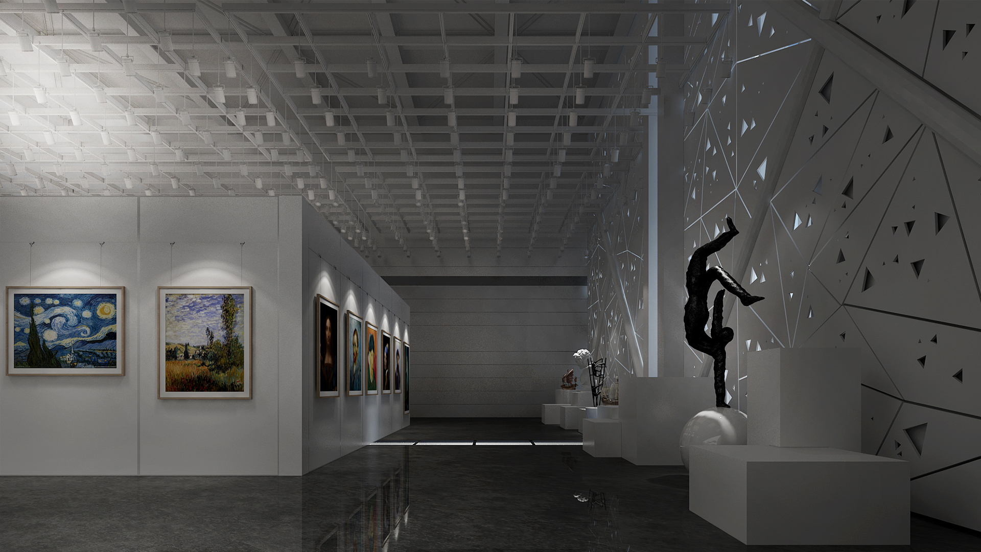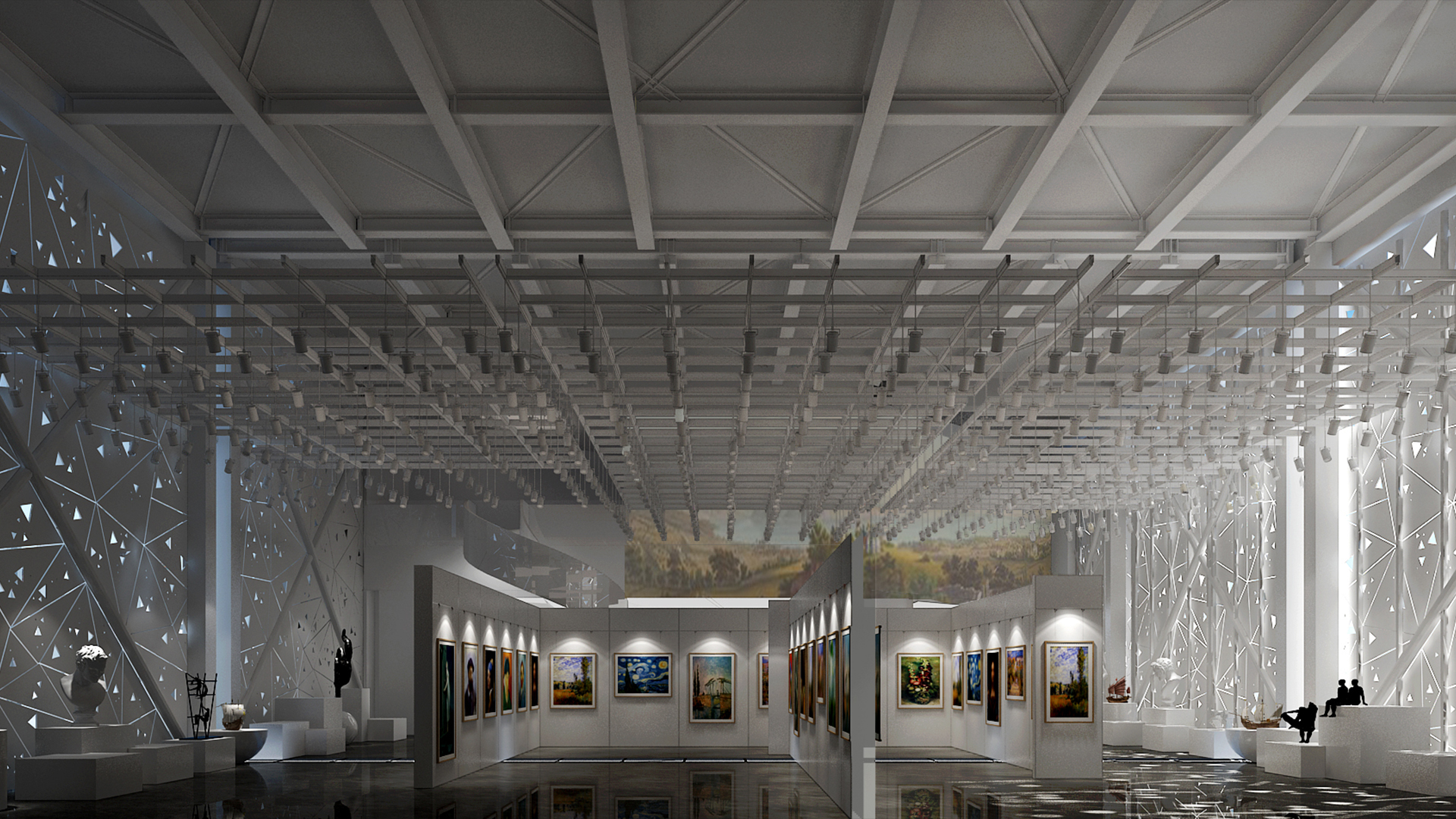 展館主要呈現(xiàn)黑白灰三色,黑白灰的色彩具有很高的審美價(jià)值,他們相互襯托,對(duì)比強(qiáng)烈,混合作用后會(huì)產(chǎn)生意想不到的藝術(shù)效果,產(chǎn)生千姿百態(tài)的節(jié)奏,極其富有韻律感和美感。這樣的空間不僅充滿(mǎn)情調(diào),更能襯托期間多彩的藝術(shù)品、豐富的畫(huà)作和內(nèi)涵的雕塑。
