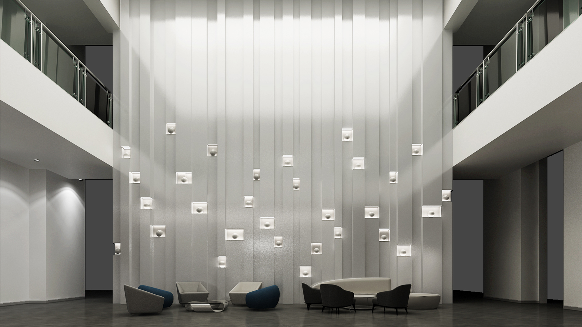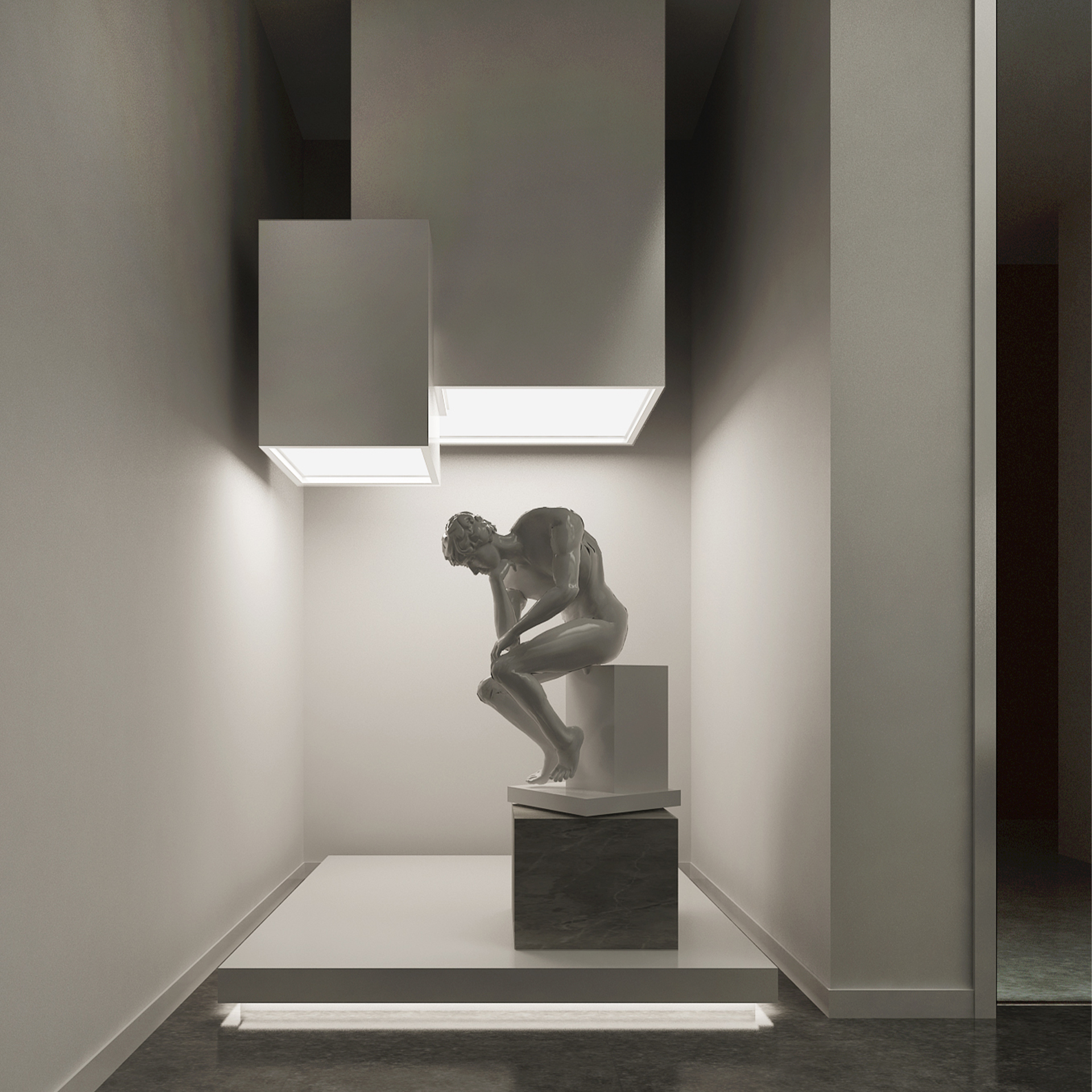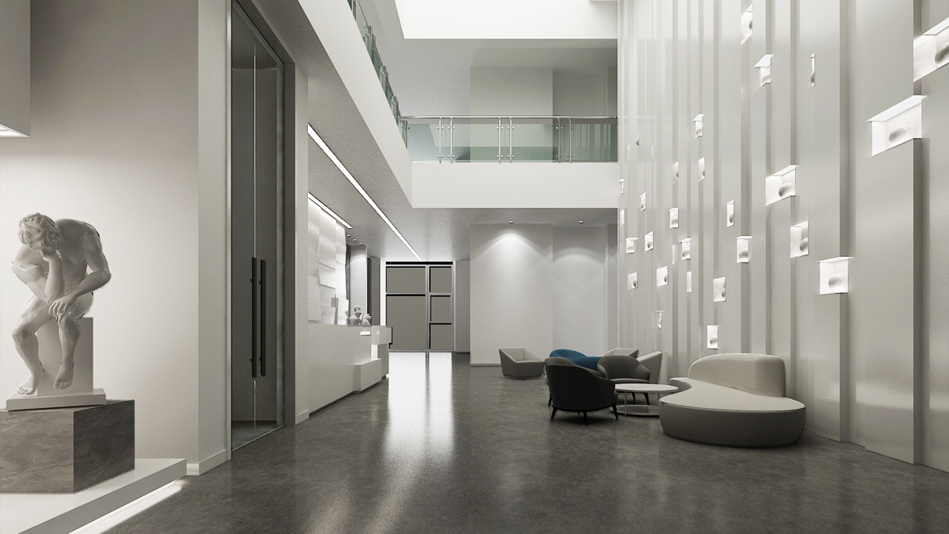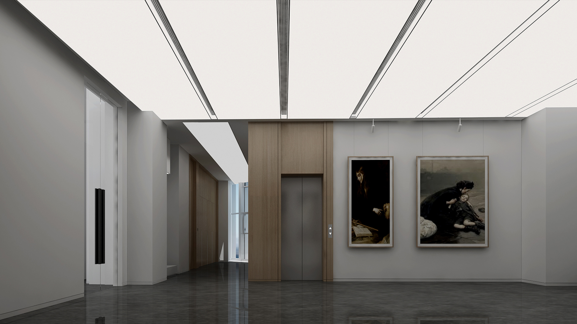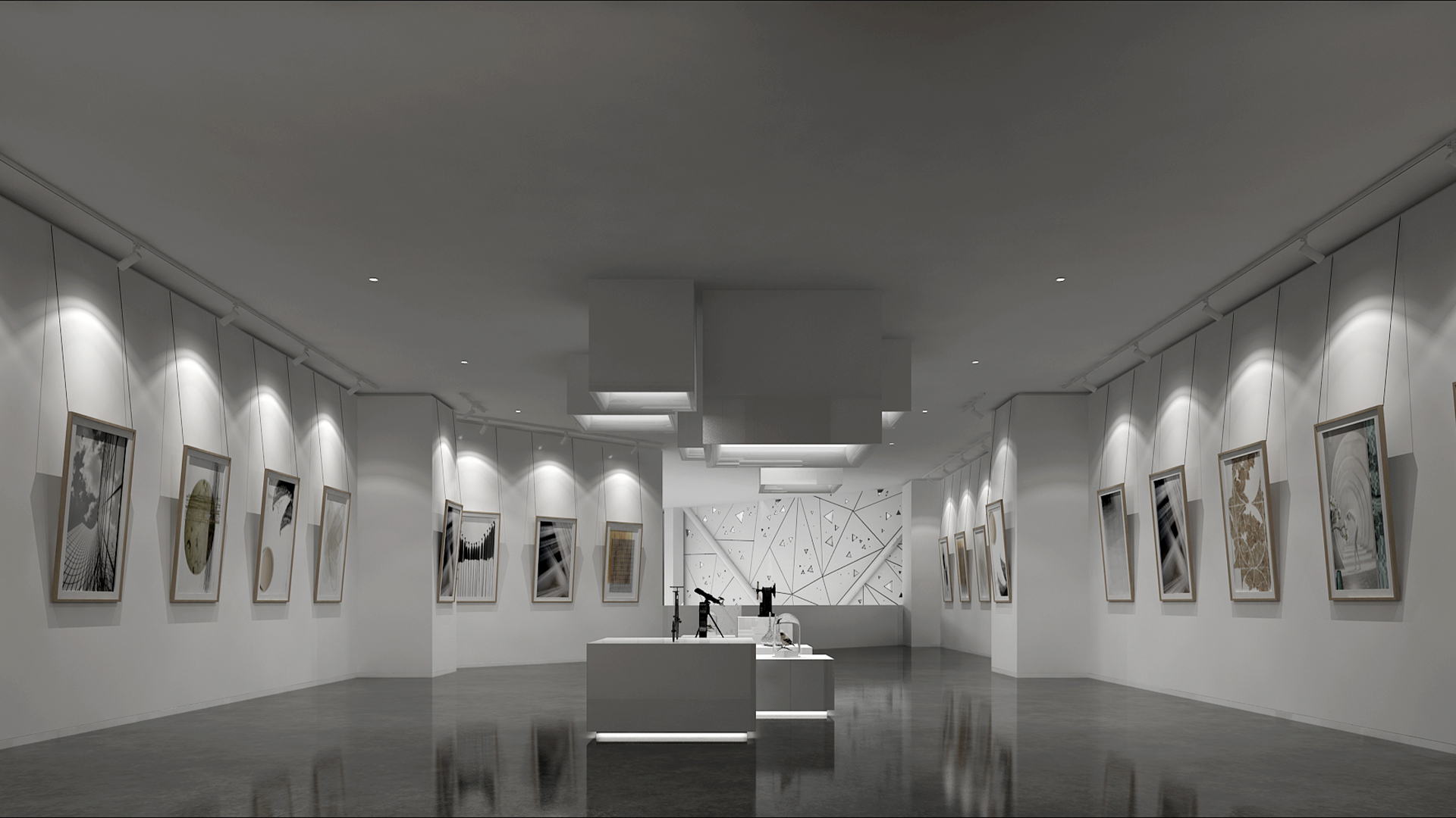 展館主要呈現(xiàn)黑白灰三色,黑白灰的色彩具有很高的審美價(jià)值,他們相互襯托,對(duì)比強(qiáng)烈,混合作用后會(huì)產(chǎn)生意想不到的藝術(shù)效果,產(chǎn)生千姿百態(tài)的節(jié)奏,極其富有韻律感和美感。這樣的空間不僅充滿(mǎn)情調(diào),更能襯托期間多彩的藝術(shù)品、豐富的畫(huà)作和內(nèi)涵的雕塑。