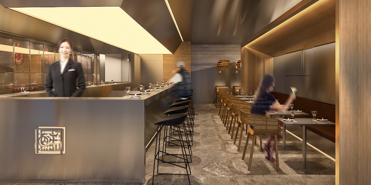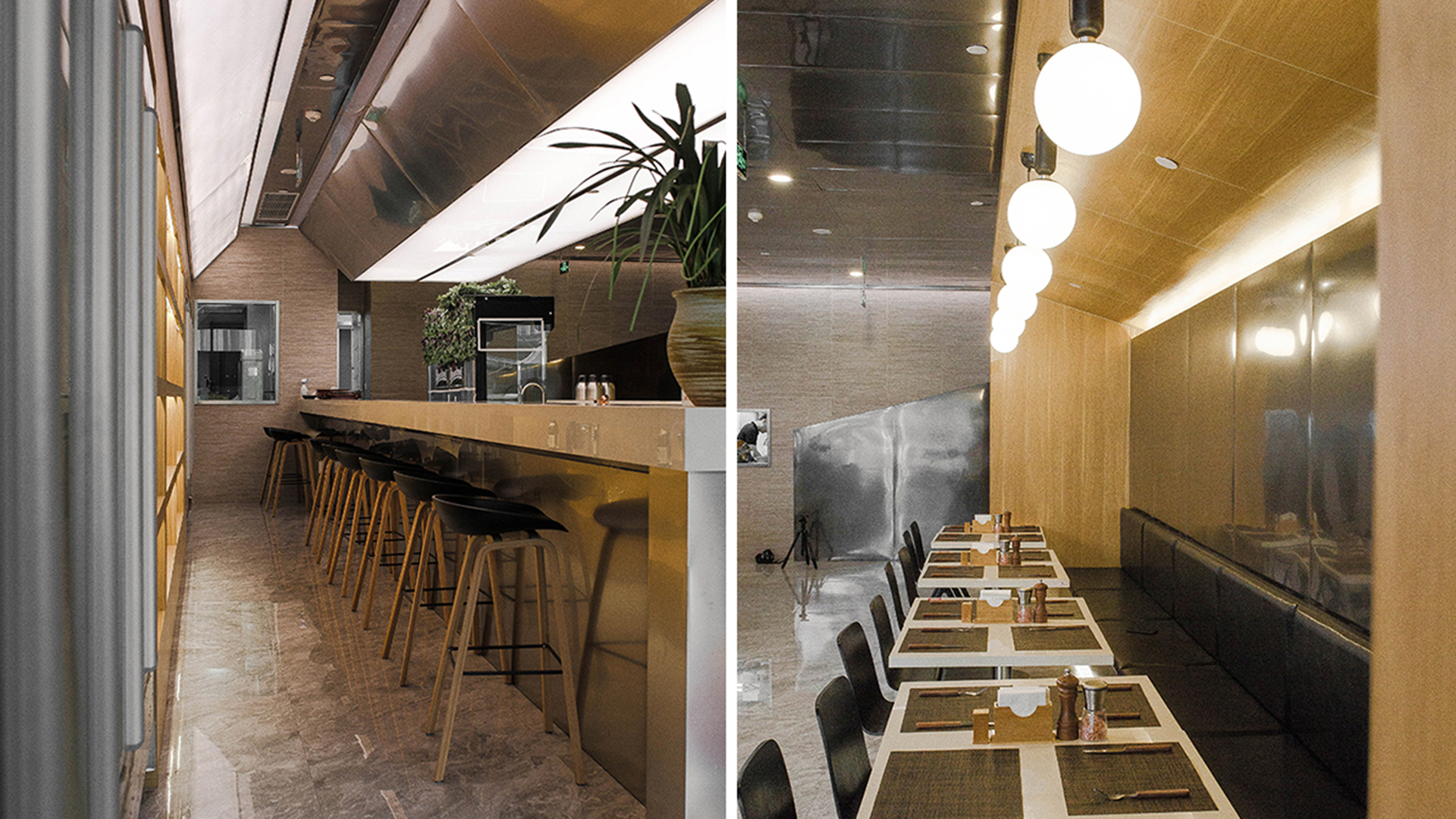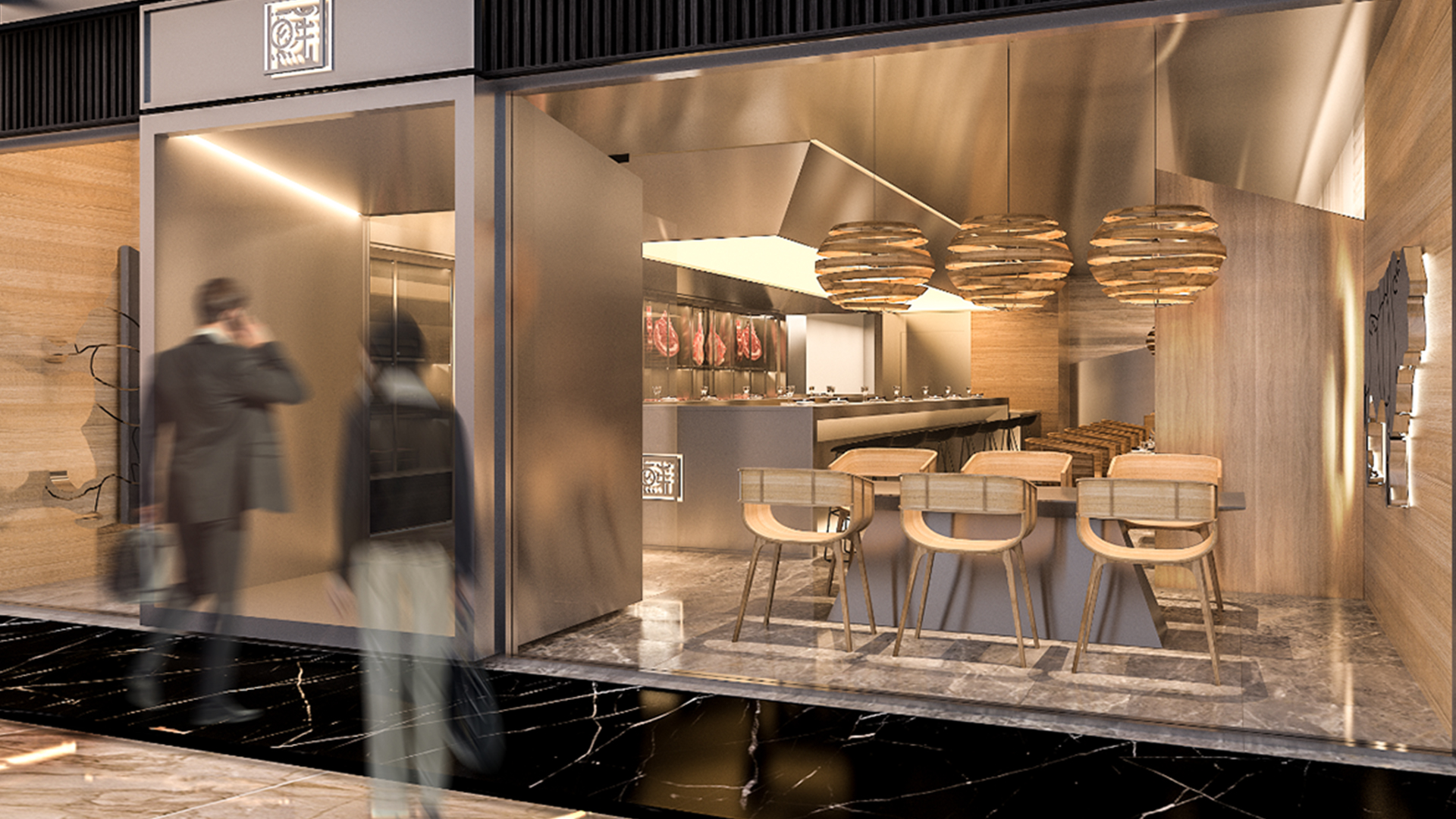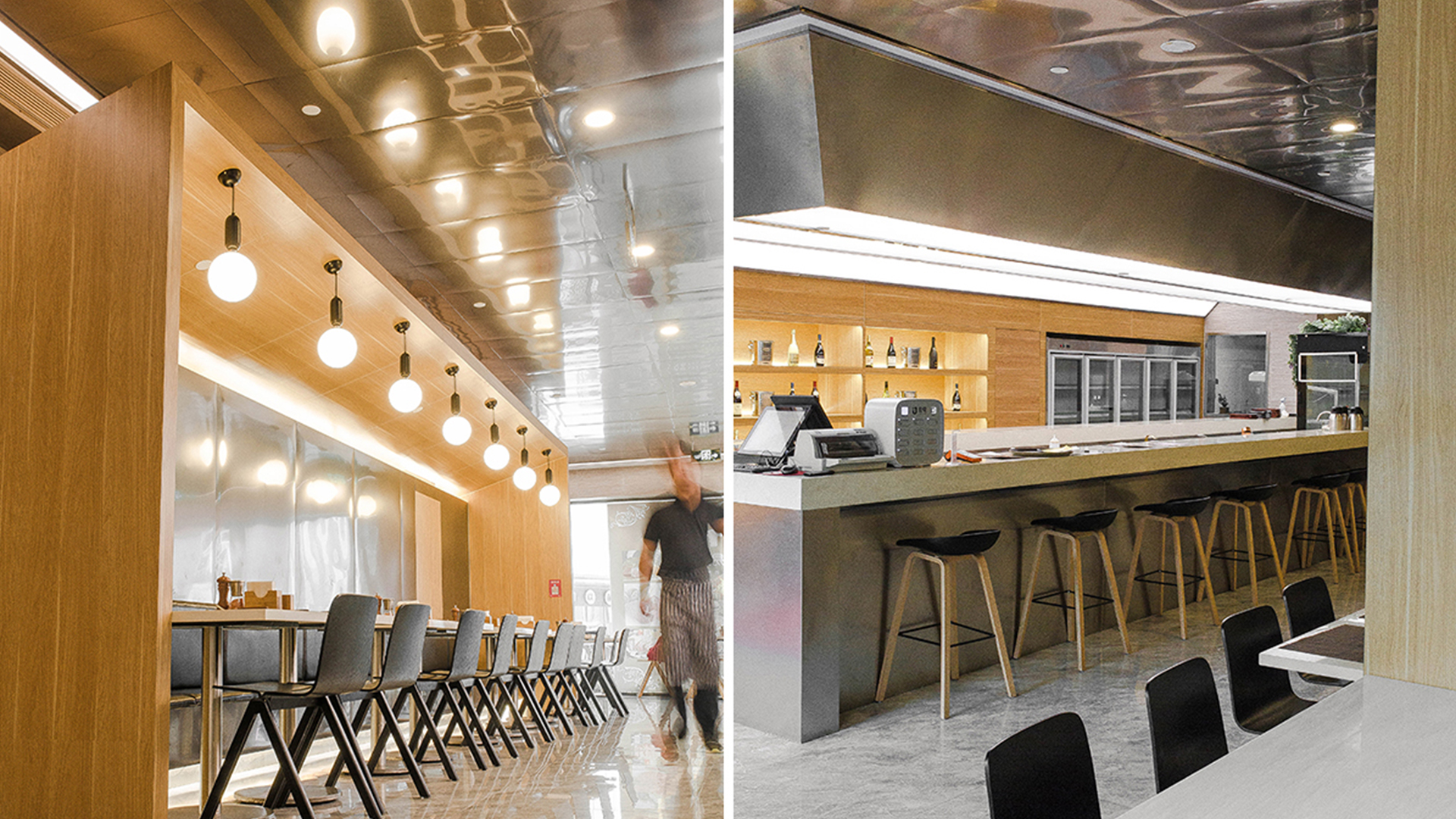 該餐廳著眼于新中產(chǎn)階級的生活定義,以回味自然(沉浸于自然的環(huán)抱,享受自然的美食藝術)和實驗留鮮(用科研的精神留住新鮮,不辜負自然的美食饋贈)的概念定位,結合設計美學,融合了西方飲食文化影響的現(xiàn)代設計方式,為美食和顧客的沉浸式體驗營造了一處健康且又時尚精致的環(huán)境。對易見鮮而言,設計借助較小的體量捕獲一種簡約自然但又豐富、精細的美學。大面積的不銹鋼板用于天花飾面裝飾,限定了餐廳開放區(qū)域。狹長大面積的片狀頂燈懸掛在中央吧臺區(qū)域。這一強有力的空間元素有助于劃分空間、集中照明同時吸引餐廳內外的目光,成為整個空間核心焦點。通過廚房的直接開放,為客戶展現(xiàn)正確的牛排烹飪方式,用餐體驗得到進一步提升,讓來自廚房的活力滲透到整個餐廳。