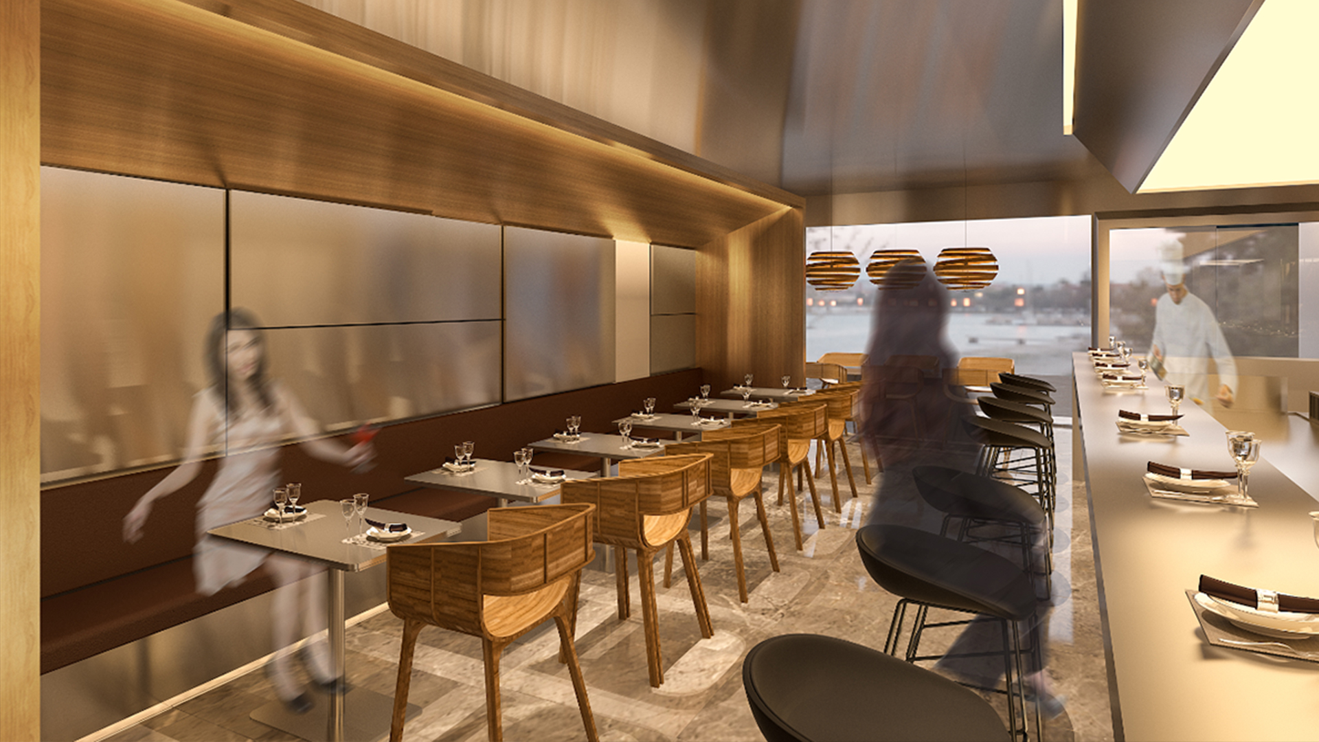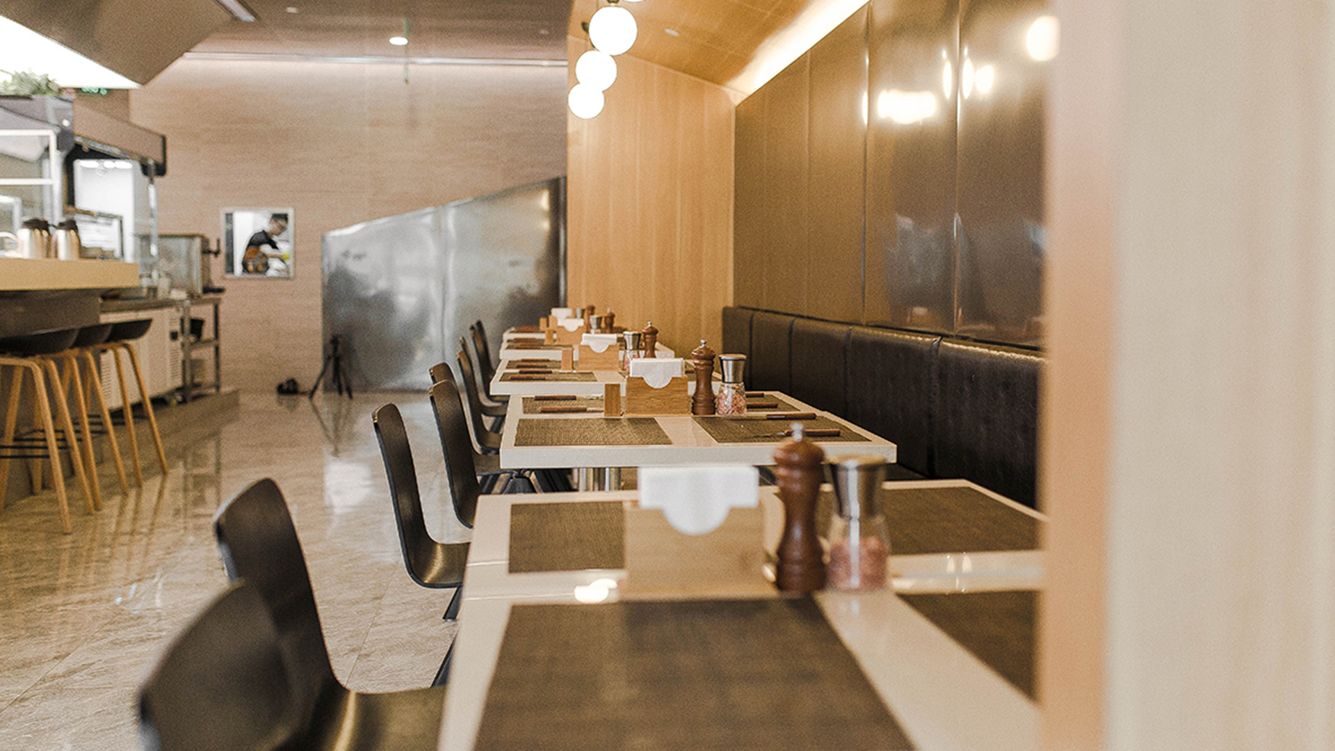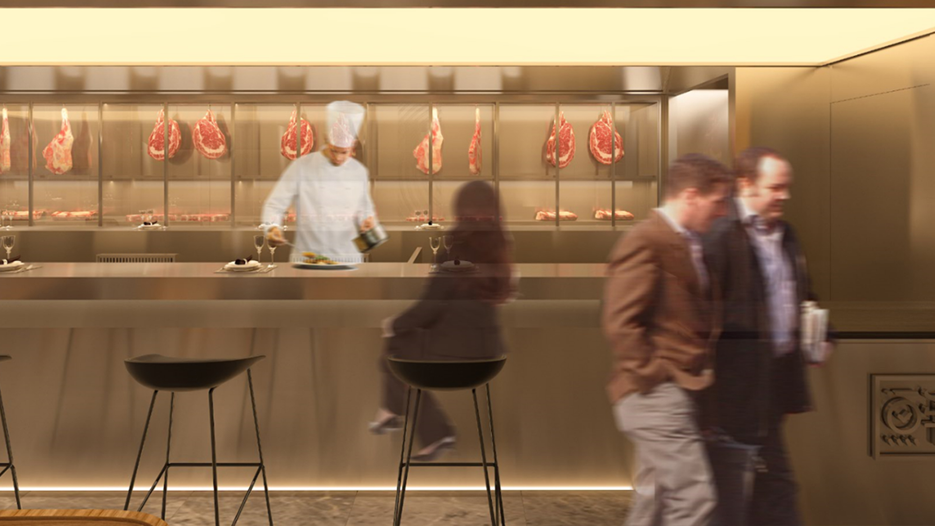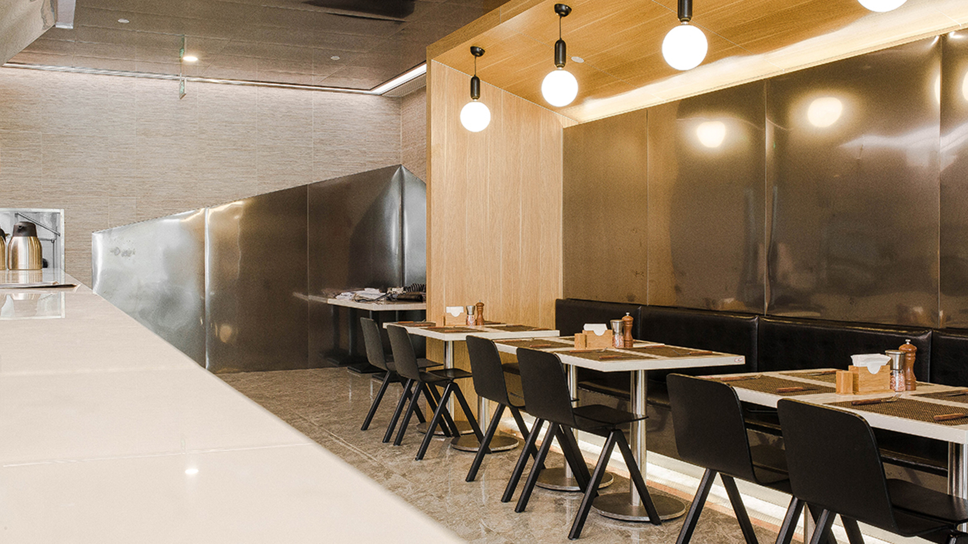 該餐廳著眼于新中產(chǎn)階級的生活定義,以回味自然(沉浸于自然的環(huán)抱,享受自然的美食藝術)和實驗留鮮(用科研的精神留住新鮮,不辜負自然的美食饋贈)的概念定位,結合設計美學,融合了西方飲食文化影響的現(xiàn)代設計方式,為美食和顧客的沉浸式體驗營造了一處健康且又時尚精致的環(huán)境。對易見鮮而言,設計借助較小的體量捕獲一種簡約自然但又豐富、精細的美學。大面積的不銹鋼板用于天花飾面裝飾,限定了餐廳開放區(qū)域。狹長大面積的片狀頂燈懸掛在中央吧臺區(qū)域。這一強有力的空間元素有助于劃分空間、集中照明同時吸引餐廳內外的目光,成為整個空間核心焦點。通過廚房的直接開放,為客戶展現(xiàn)正確的牛排烹飪方式,用餐體驗得到進一步提升,讓來自廚房的活力滲透到整個餐廳。