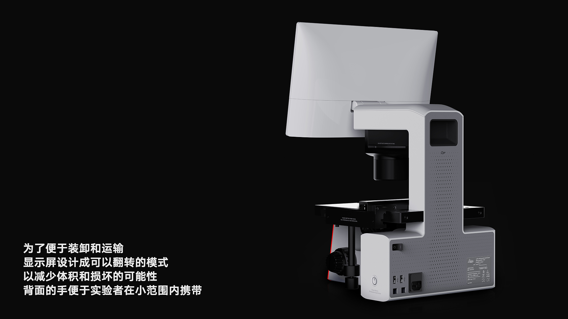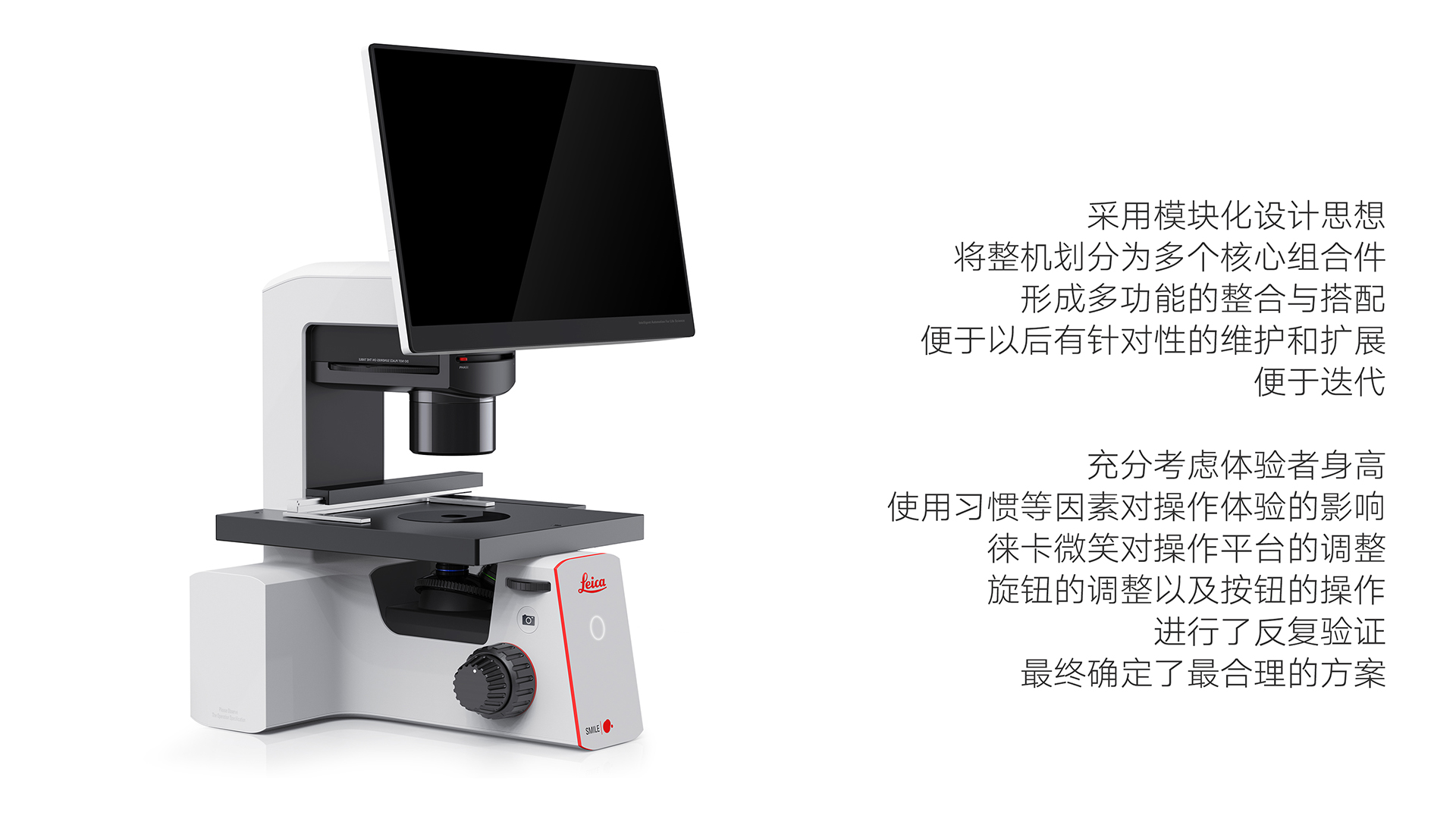 該顯微鏡采用模塊化設(shè)計思路,將整機分類成多個核心組合部件,形成多功能的整合與搭配。方便后期進行針對性維修和拓展,便于迭代。充分考慮實驗者身高,使用習(xí)慣等因素對操作體驗的影響,徠卡SMILE對操作臺的調(diào)節(jié),旋鈕的調(diào)節(jié),按鈕的操作等進行反復(fù)的驗證,最終確認最合理的方案。產(chǎn)品為方便搬運和運輸,將顯示屏設(shè)計成可翻折的模式,減小體積,減小損傷的可能性。背后的摳手方便實驗人員在小范圍內(nèi)搬運。